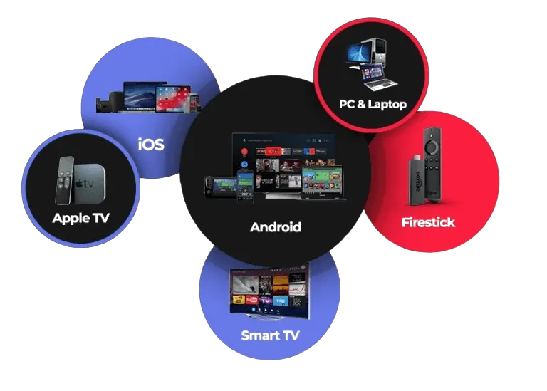 Fully compatible across a wide range of devices, including MAG, Android, Kodi, Enigma, Streaming Services Box, PCs, and Smart TVs.